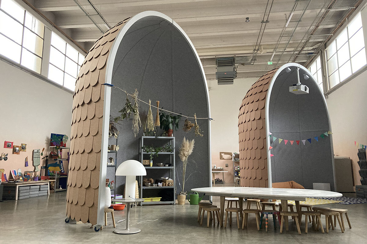 Tucked in the back of the Palais de Tokyo, a sweeping modern art museum in Paris, is a large studio. Called Le Hamo, like the French word for hamlet, it is just like its homophone – cozy and inviting. Wormlike ceramic shelving shows off amateur artwork: rust-colored clay figurines and sculptures made of old batteries, cardboard, and toothpicks.