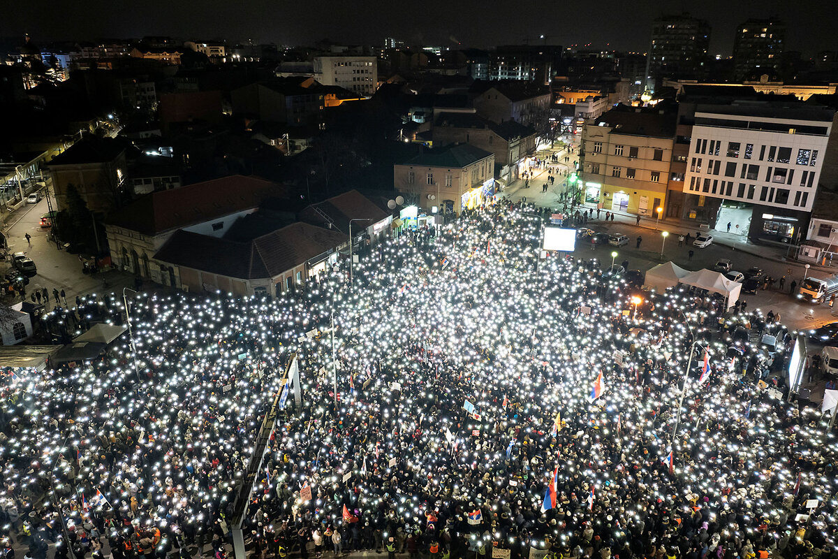 As he speaks, an anti-corruption protest led by students and supported by broad sectors of society has entered its ninth hour in Kragujevac, an industrial city 200 kilometers (125 miles) away in central Serbia, where people from all over the country had converged.