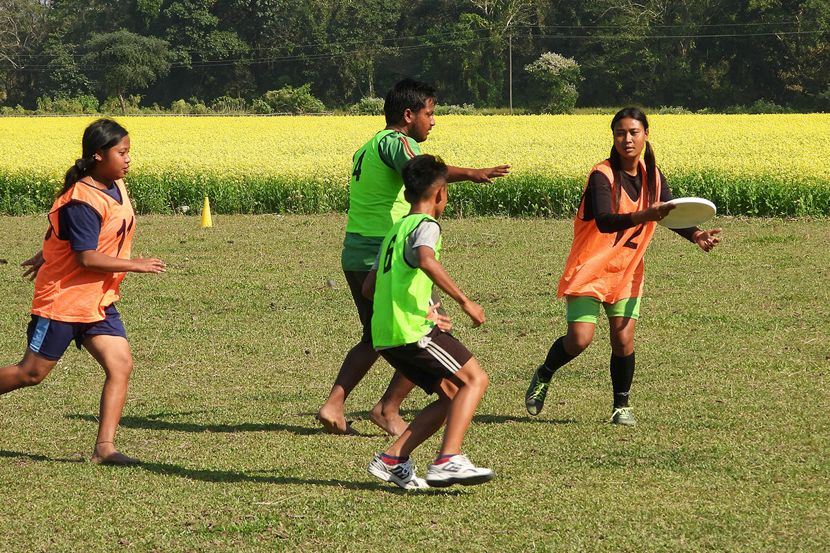 The American flying disc game officially known as ultimate – or “ultimate Frisbee,” for those not worried about trademark infringement – was virtually unheard of in this part of the world till a few years ago. But it’s rapidly gaining popularity throughout northeast India. That includes Assam’s Chirang district, where over 30 girls and boys gathered in Rowmari village last December for a coaching session organized by the Action Northeast Trust (ant), a rural development nonprofit. They are some of the best players from the hundreds of ultimate teams in and around Chirang. After a warmup, the friendly match begins.