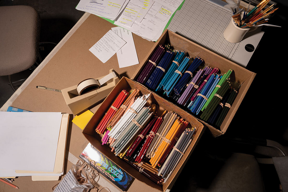 On a long table, Jeffrey Greene prepares bundles of colored pencils for delivery to Connecticut state prisons. Artists have jotted their requests on slips of paper. “White charcoal pencil,” reads one, which also lists pencils in red, may green, and grass green.