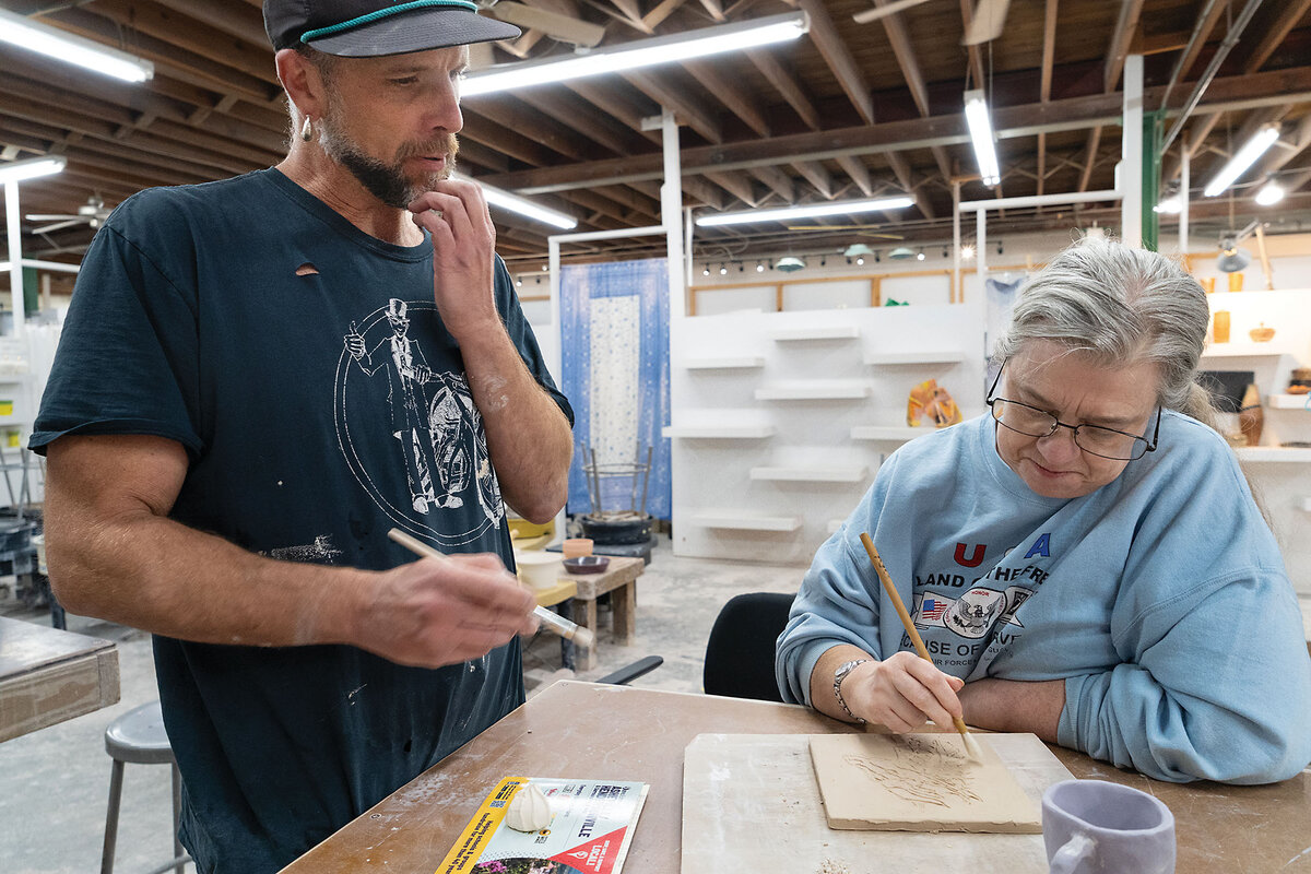 “When you start doing pottery, you just lose yourself in it,” Roseanna Coates says while working on a series of ceramic tiles during one class. “It’s a better form of therapy than any therapy I’ve ever had.”