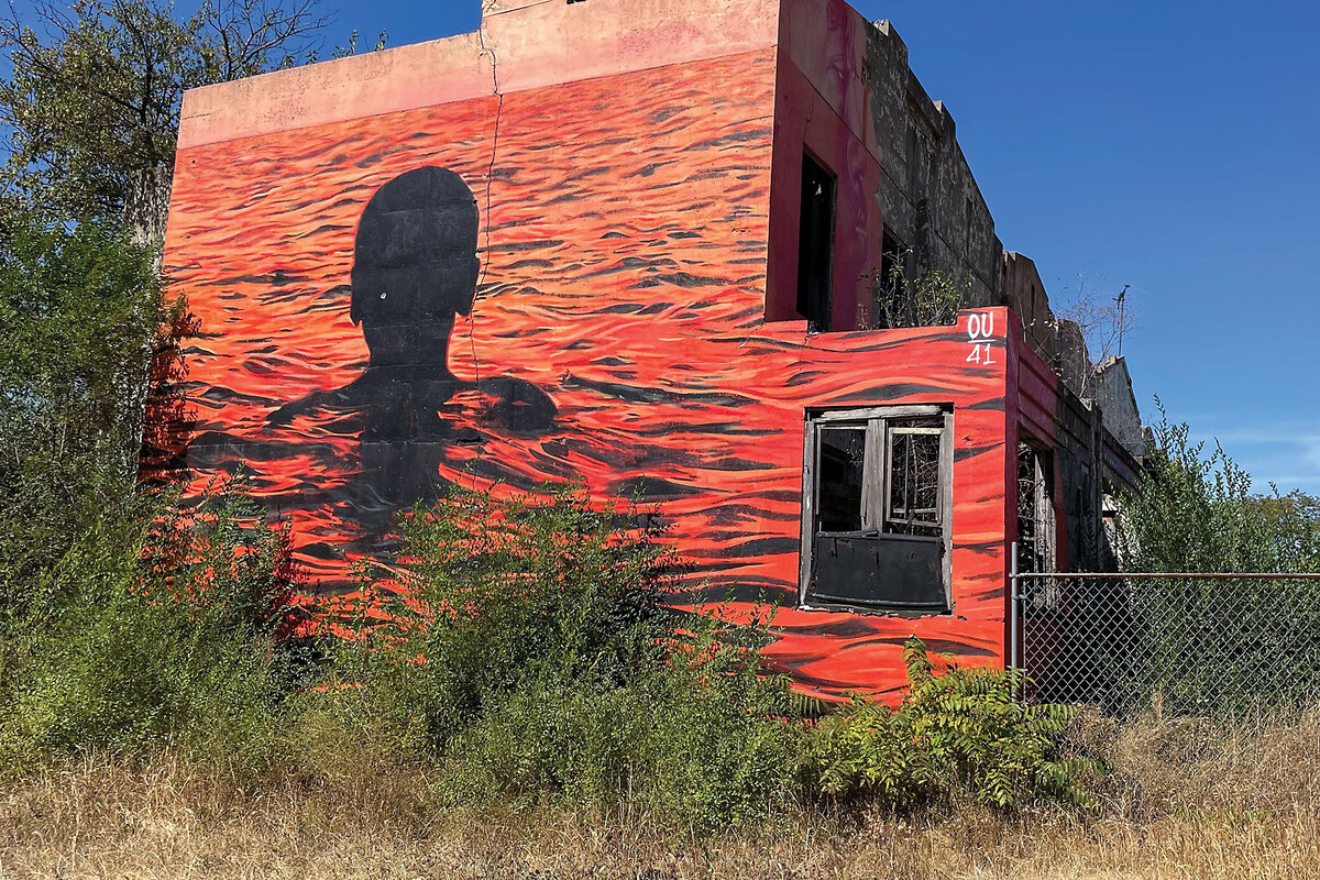 Some of the most powerful images created as part of the mural initiative reside on a haunting, decayed block of Edison Concept Houses, constructed in 1913 by a subsidiary of U.S. Steel from inventor Thomas Edison’s patent for single-pour concrete homes. On one of the residences’ battered surfaces, a mural by Nevada artist Erik “OverUnder” Burke depicts rapper Freddie Gibbs, a Gary native. Another recalls Chicago’s Red Summer of 1919, a period of deadly racial violence sparked by the killing of a 17-year-old Black boy whose raft drifted inadvertently into a white swimming area at a de facto segregated beach.