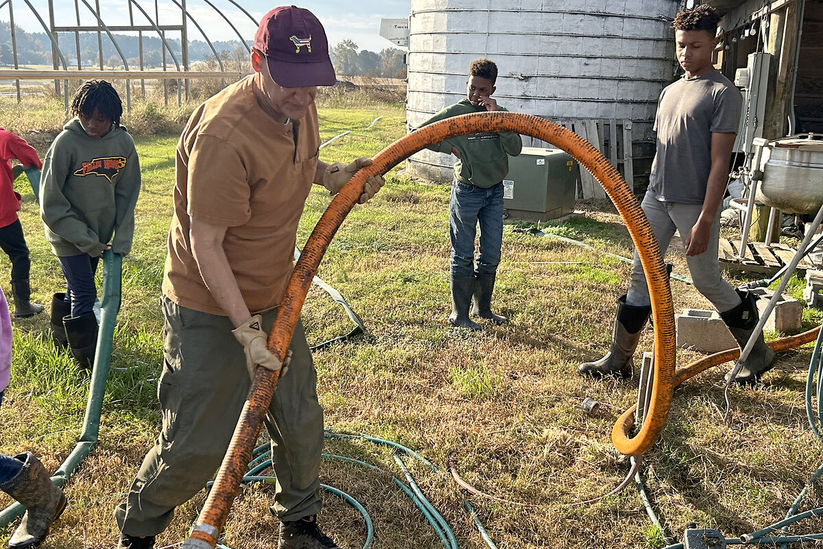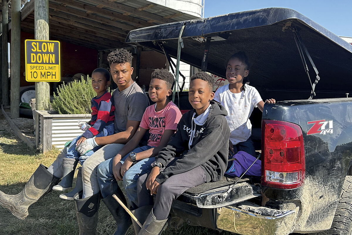 Bright one Sunday morning, things are busy at the farm. Mr. Brown rolls up to the front of the property in a heavy-duty pickup truck with his work staff: six of his eight children, running in age from 5 to 17. His eldest son, JW, pulls up in a blue tractor. Volunteer Tom Schad, whom Mr. Brown refers to as Brother Tom, meets them at a 4,000-gallon water tank that needs to be fixed for proper irrigation.