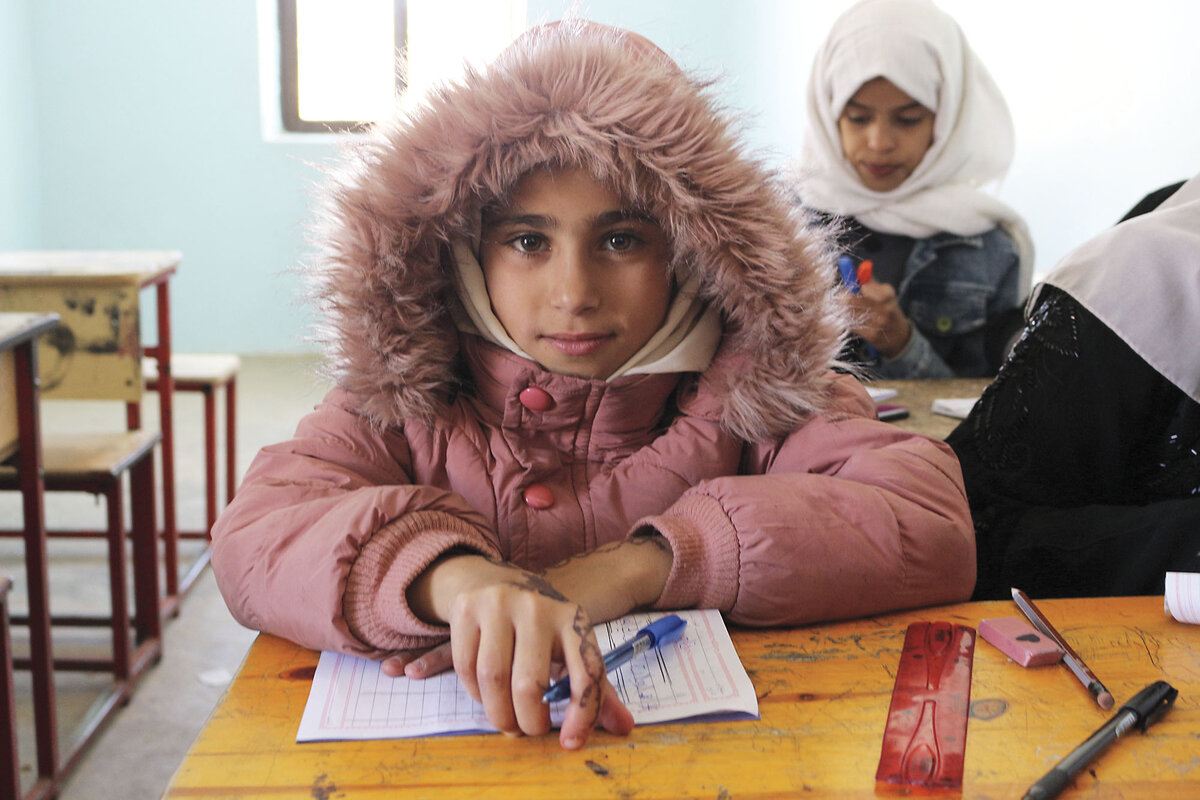 Seventeen-year-old Fatima Mujib sits on a worn wooden chair in a narrow, makeshift classroom. Bundled up to keep warm in the rundown stone building, she quietly listens as teacher Munia Saeed presents the day’s lesson.