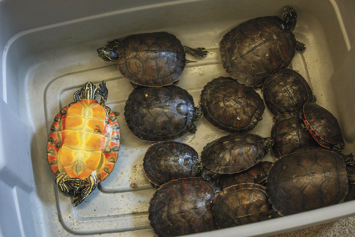 On a cloudless afternoon at a quiet pond in Plymouth County, cattails and lily pads float near the water’s edge. It’s a welcoming of sorts for nearly one hundred baby cooters, keen to swim freely in freshwater for the first time.