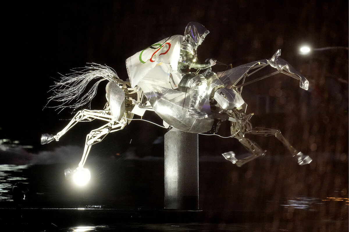 A torch bearer skimmed over rooftops while running through the city and acrobats flipped flawlessly and held onto each other in the rain. There were French history displays and appreciation of French visionaries. There was a call for unity in the world, and through it all, the flag bearer continued, galloping on a horse along the Seine before reaching the Eiffel Tower and walking solemnly up a steep set of stairs and toward a pole where the Olympic flag was raised.