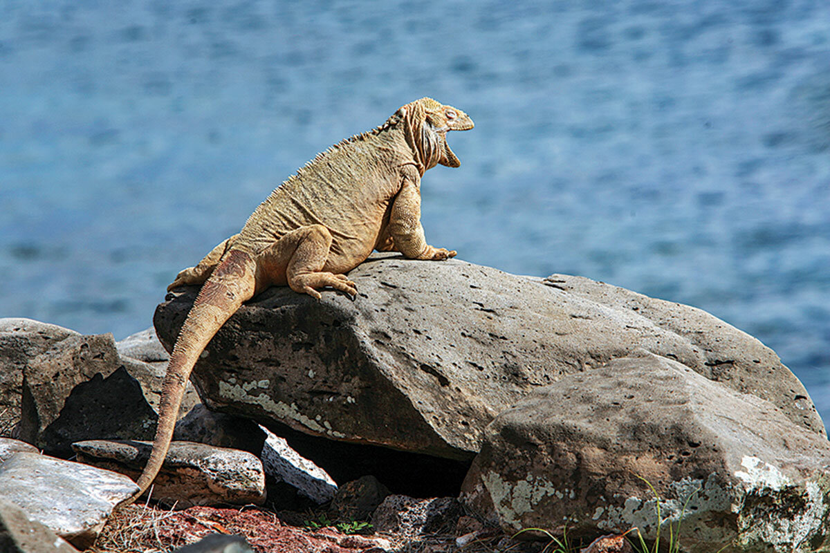 Land iguanas are once again breeding on Santiago Island after 187 years of local extinction. When Charles Darwin explored the Galápagos Islands off the coast of Ecuador in 1835, he recorded an abundance of land iguanas. By the early 1900s, these lizards had vanished from Santiago Island, likely due to the interference of introduced species such as feral pigs, goats, and donkeys.